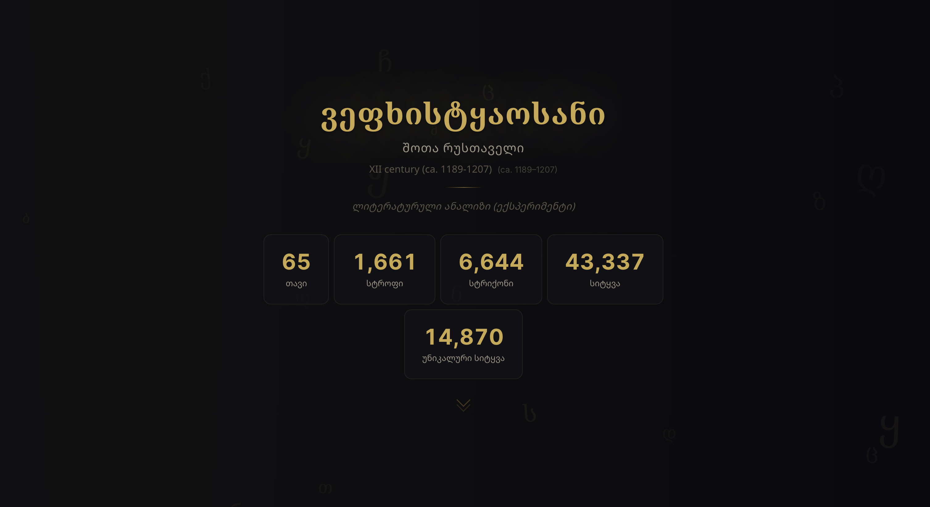 - Hero — Poem stats with floating Georgian letter background
